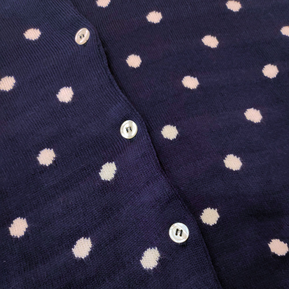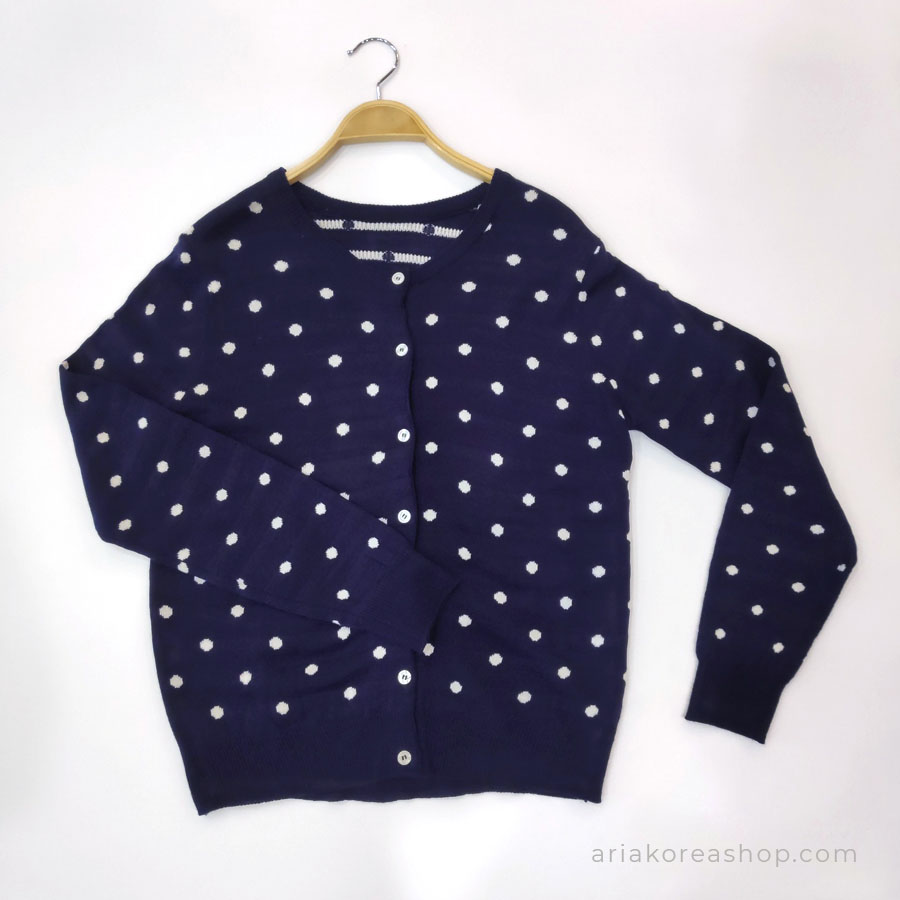 Áo khoác len Hàn Quốc họa tiết chấm bi. Áo chất liệu len có độ dày vừa phải. Dáng áo rộng, bo nhẹ ở gấu và tay áo.