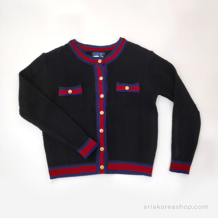 Áo khoác len Hàn Quốc, chất liệu dày dặn, ấm áp. Áo phối chi tiết viền màu xanh, đỏ, cùng hàng cúc vàng.