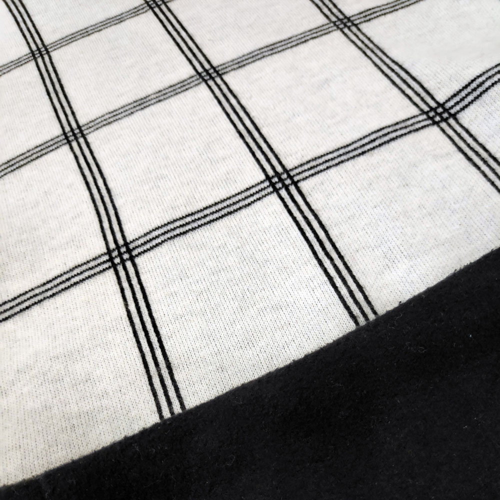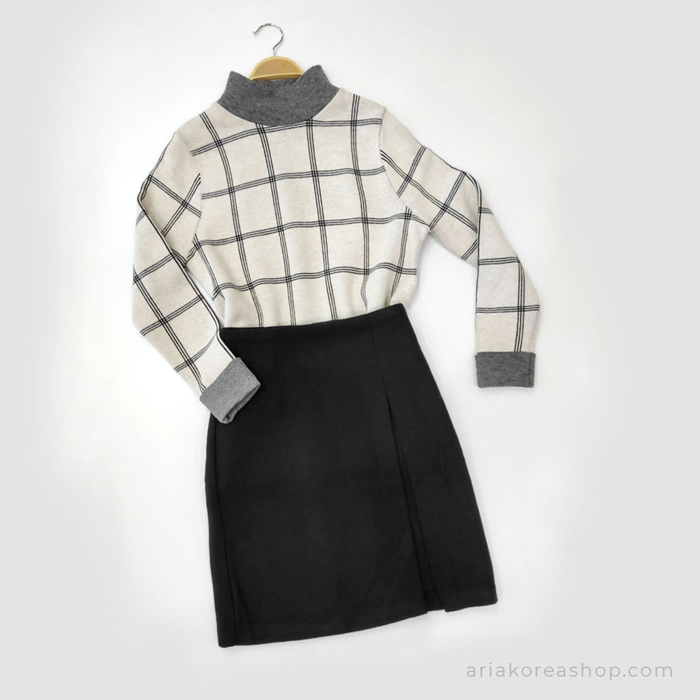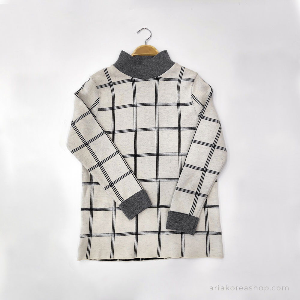 Áo len Hàn Quốc kẻ ô vuông to, dáng xuông, nền trắng, kẻ ghi đen.