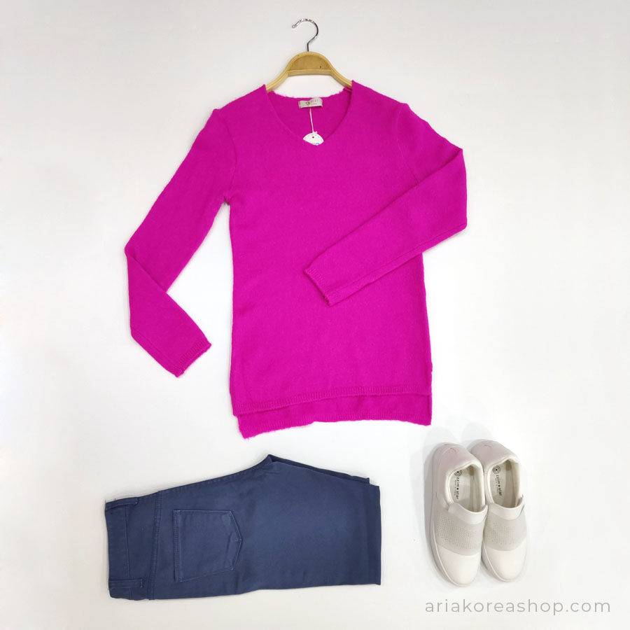 Áo len cổ tim, chất liệu êm, nhẹ nhưng ấm áp. Áo dáng hơi ôm, màu sắc tươi tắn.