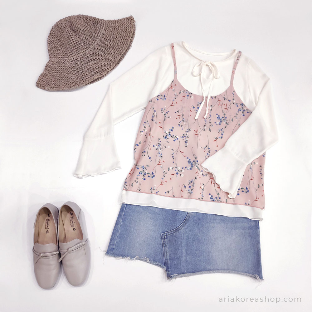 Áo sơ mi Hàn Quốc, chất liệu voan. Áo có 2 lớp, lớp phía trong trơn màu, lớp ngoài vải hoa, giả gile.