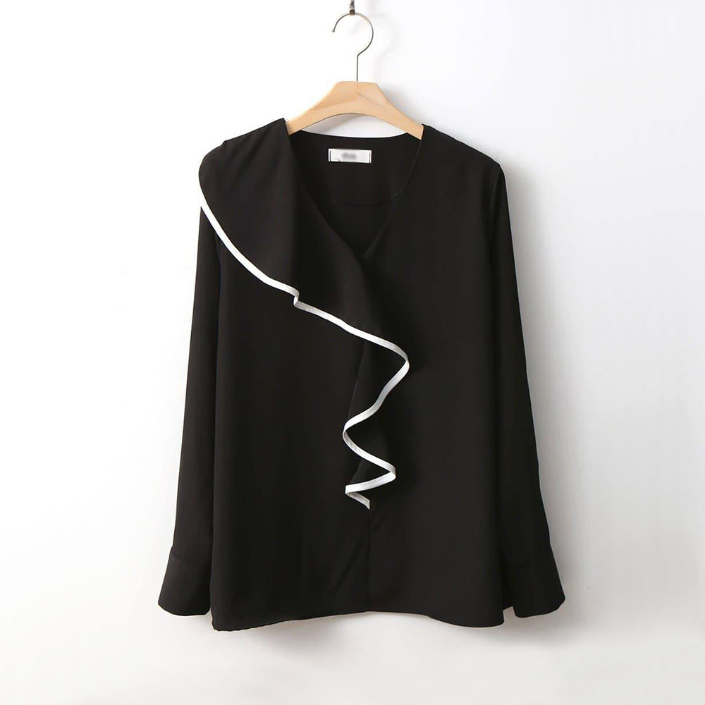 Áo sơ mi Hàn Quốc với điểm nhấn lượn sóng từ cổ xuống giữa áo. Áo màu trắng với điểm line trắng ấn tượng.