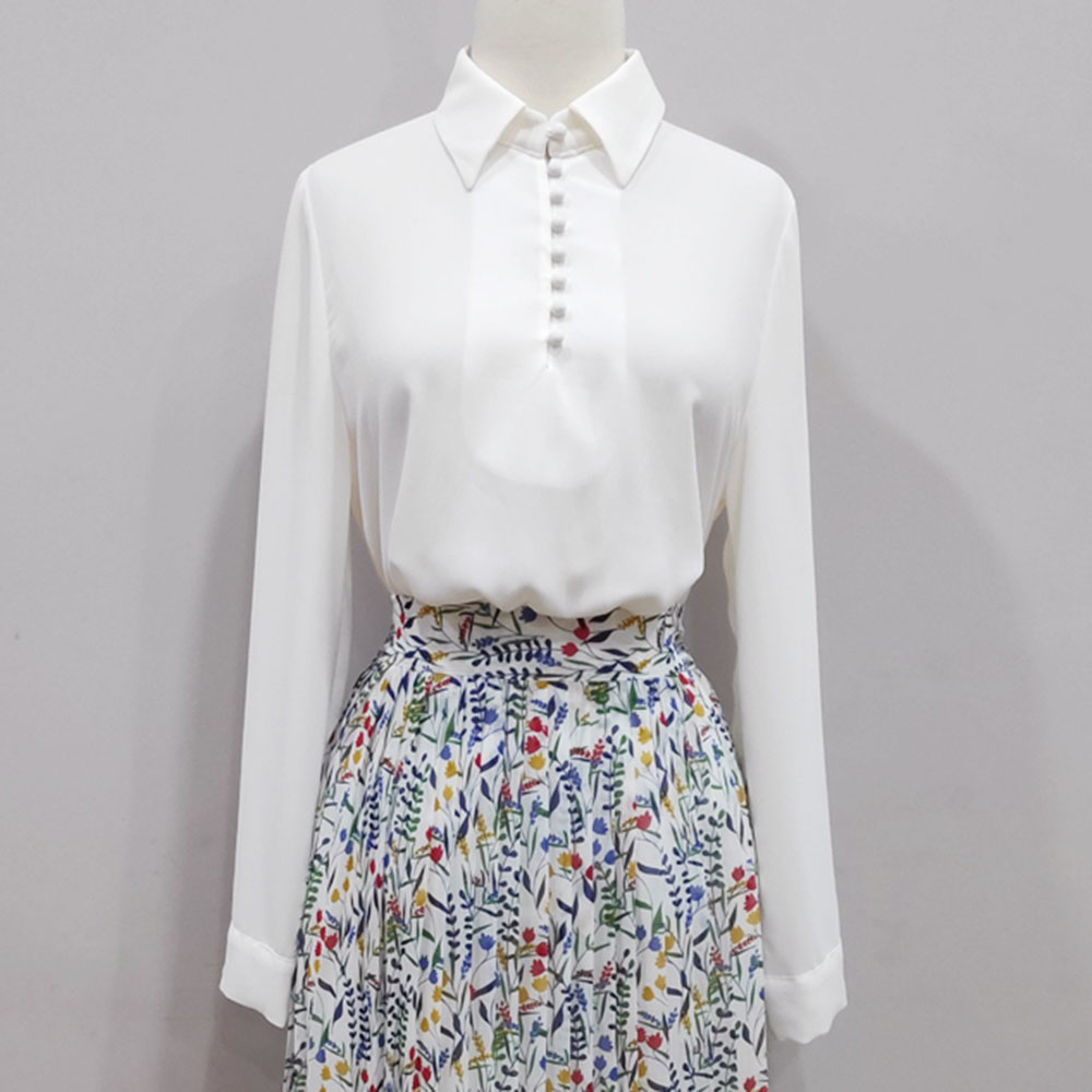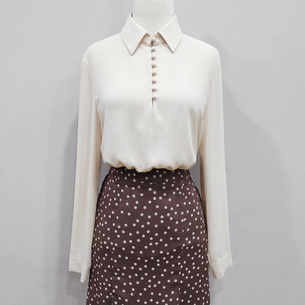 Áo sơ mi Hàn Quốc dài tay, chất liệu voan. Áo cổ bẻ cùng điểm nhấn là hàng cúc tròn đồng màu vải áo.