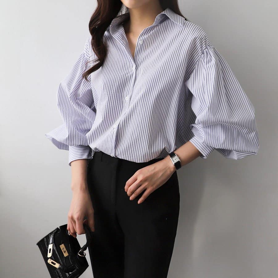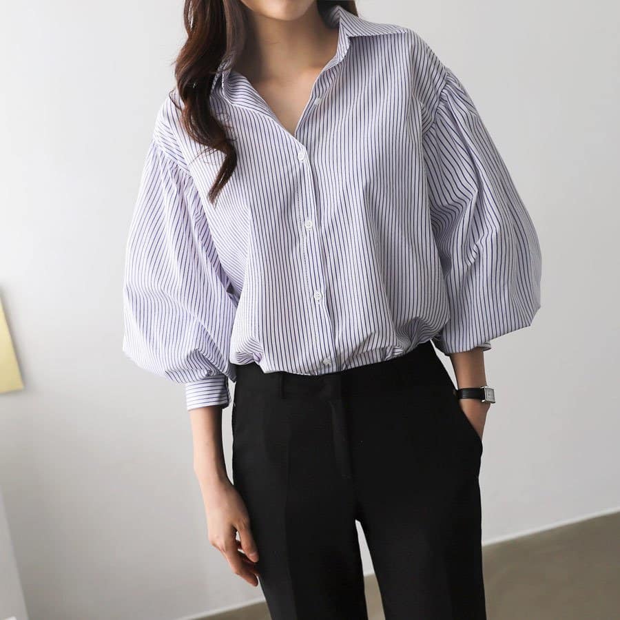 Áo sơ mi Hàn Quốc kẻ nhỏ, tay phồng ấn tượng. Áo có thể mặc đi làm, đi chơi, kết hợp được với nhiều món đồ thời trang khác.