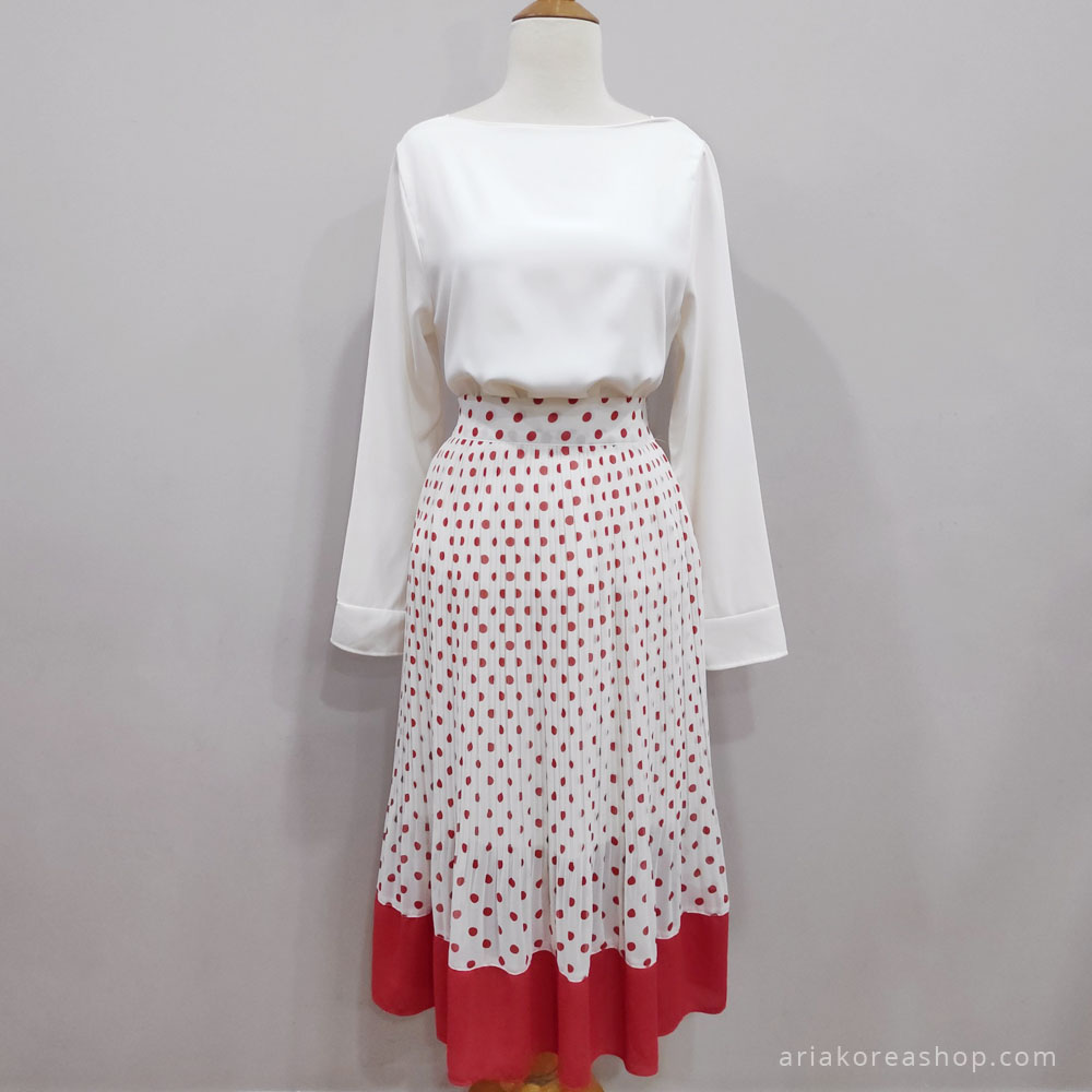Chân váy voan xếp ly chấm bi đỏ, phía sau cạp chun cùng màu vải. Chân váy freesize dáng dài, mặc thoải mái dễ chịu.