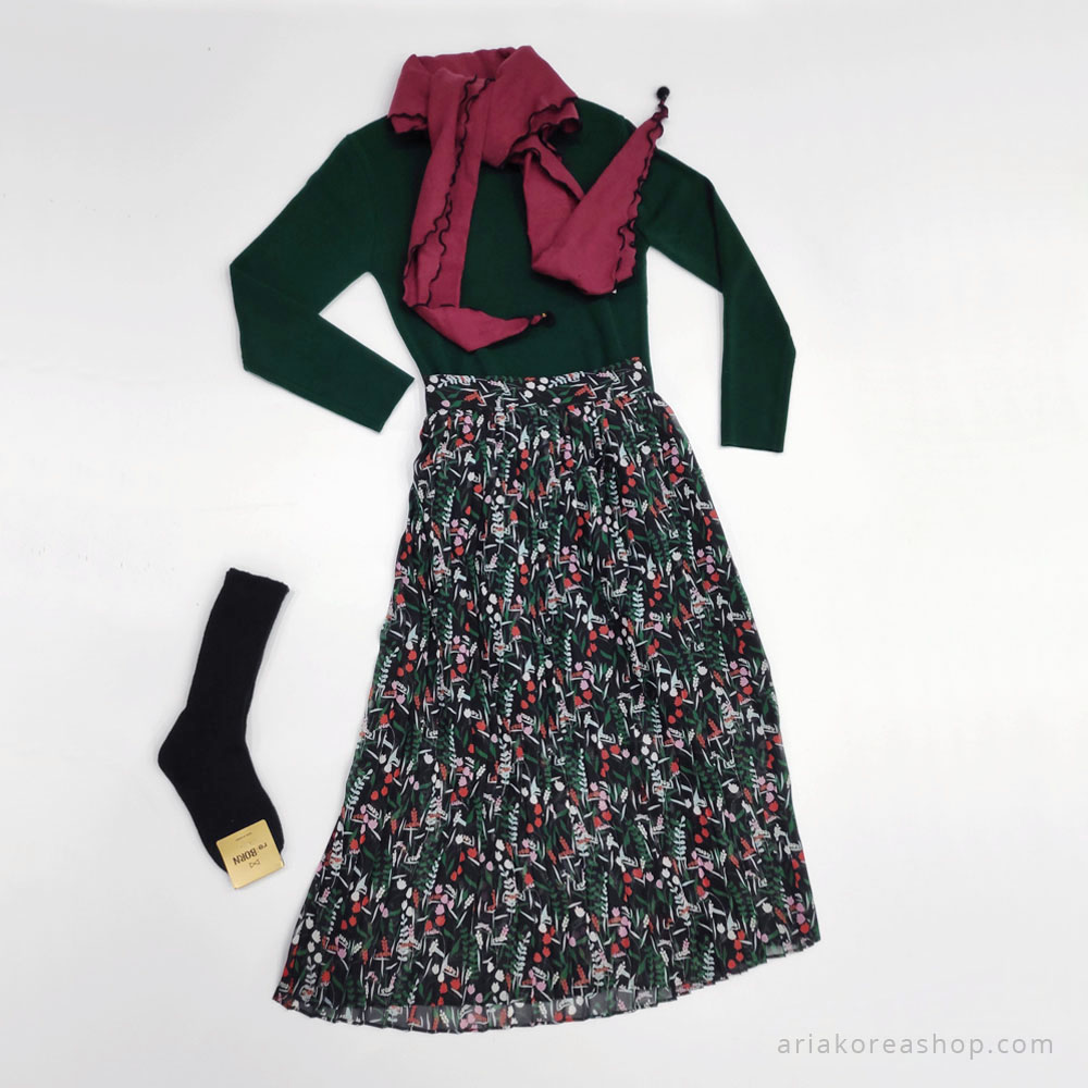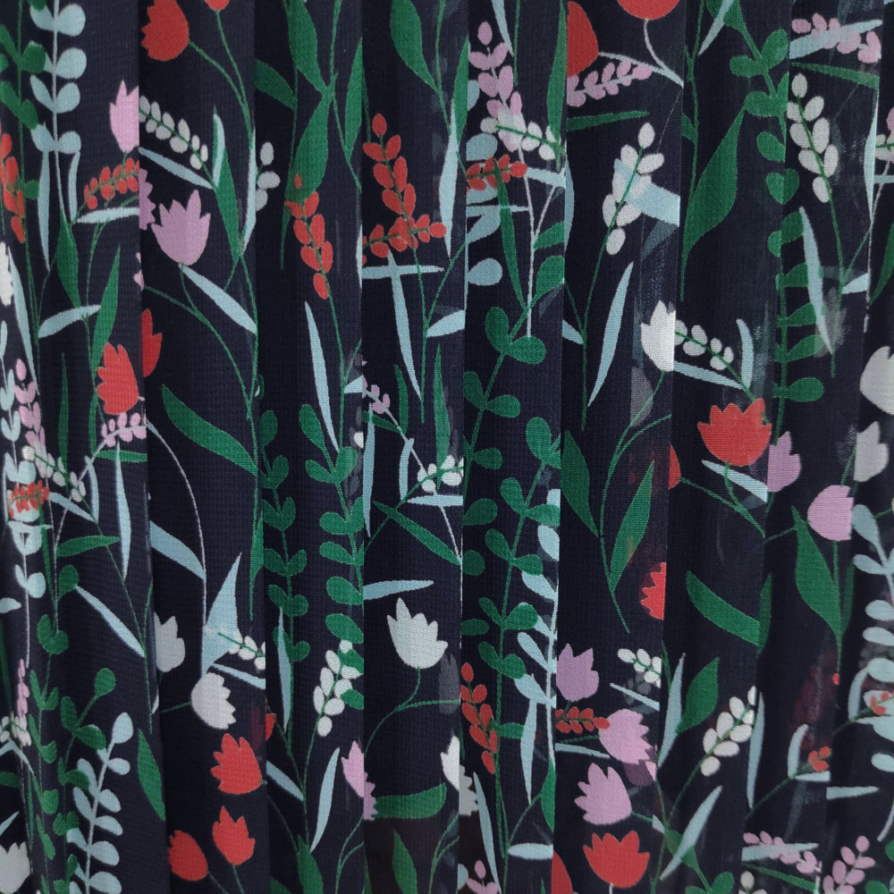 Chân váy voan xếp ly dáng dài freesize, phía sau cạp chun cùng màu vải.