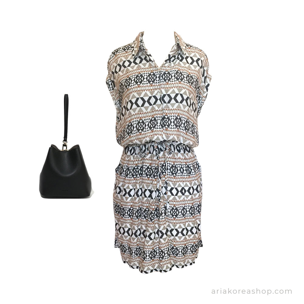 Váy Hàn Quốc Ops01584 với chất liệu thoáng mát, họa tiết hình học đặc sắc. Phần eo có đai thắt cùng màu vải, tùy chỉnh theo ý muốn. Thân trên có hàng cúc áo trắng, cổ bẻ kiểu sơmi.