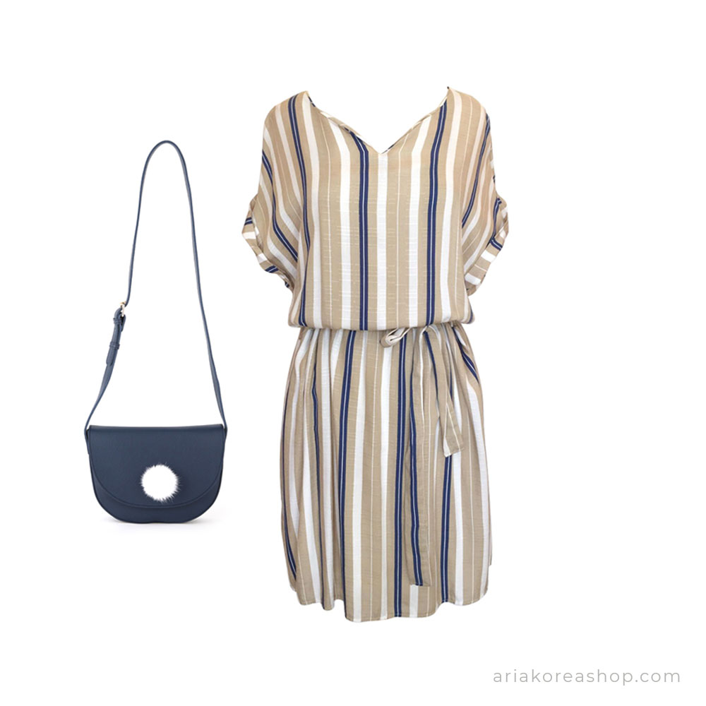 Váy Hàn Quốc Ops01585 chất liệu linen, freesize. Váy có họa tiết kẻ sọc phối màu trắng, nâu be và xanh navy.
