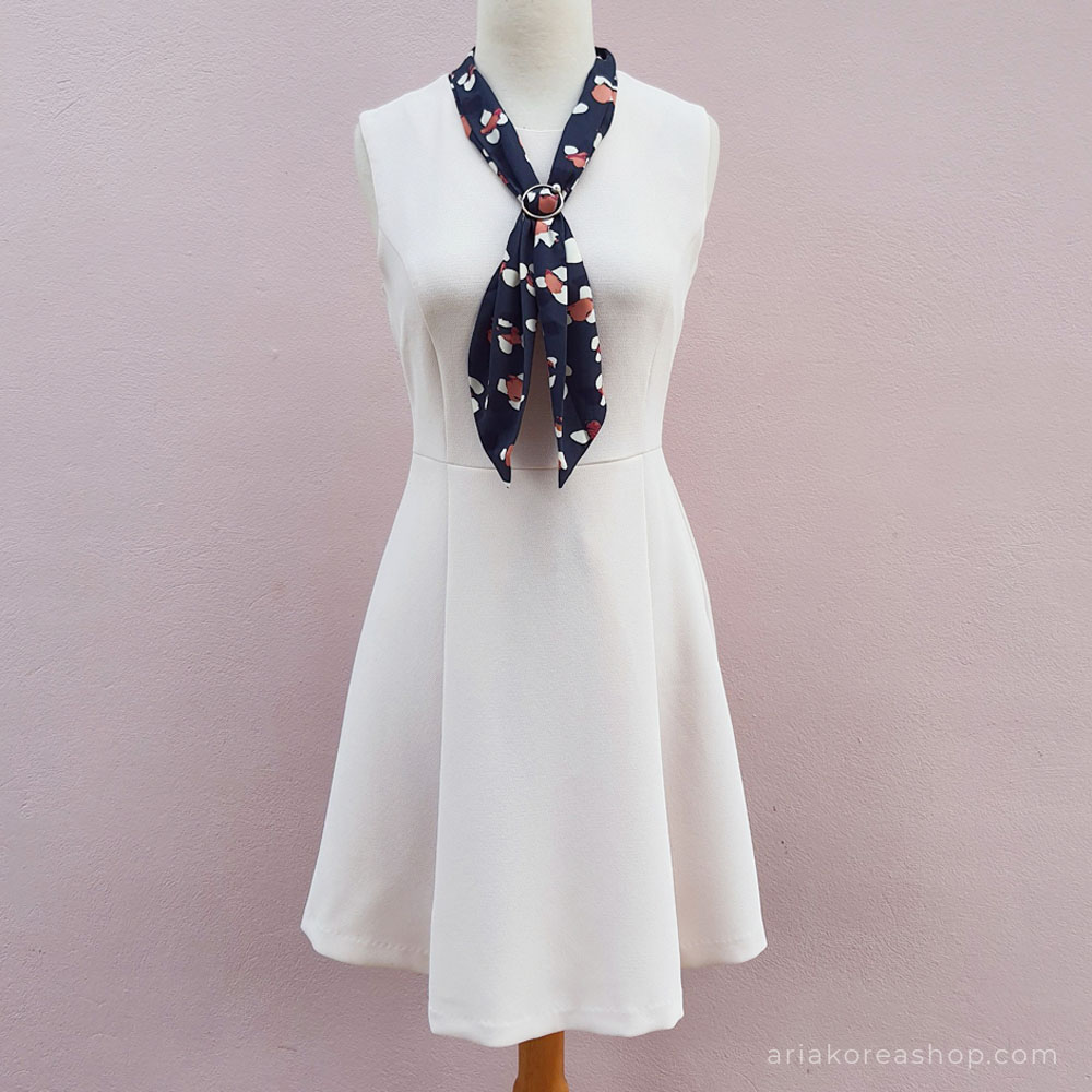 Váy freesize, có khóa kéo sau lưng (phù hợp với người từ 43-52kg). Váy có khăn cổ với khuyên tròn làm điểm nhấn xinh xắn.